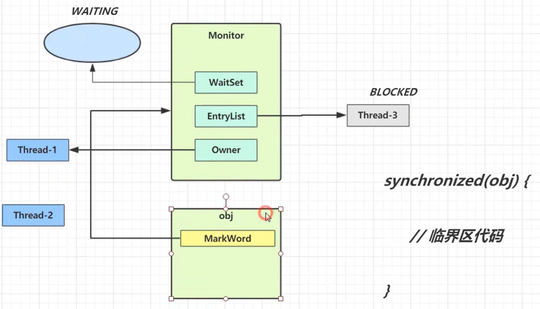 } 当执行到synchronized时, 会去检查obj对象的MarkWord是否关联monitor对象(操作系统提供), 如果没有,则让monitor对象指向该线程, 如果有,则加入Monitor的EntryList进行阻塞等待 |