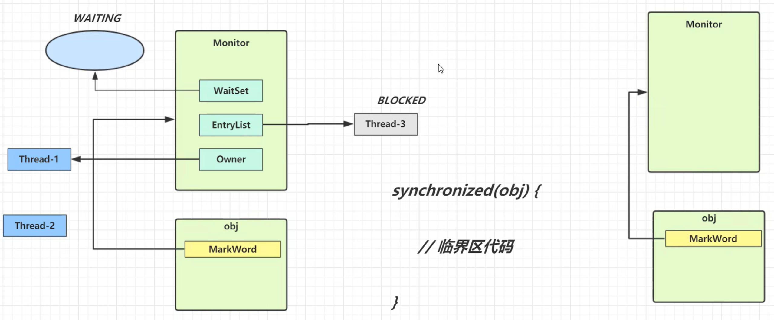 Monitor: 此对象由操作系统提供, 其结构为 Owner(指向持有Monitor的线程) + EntryList(保存等待的阻塞线程) + WaitSet(调用了wait的线程) |